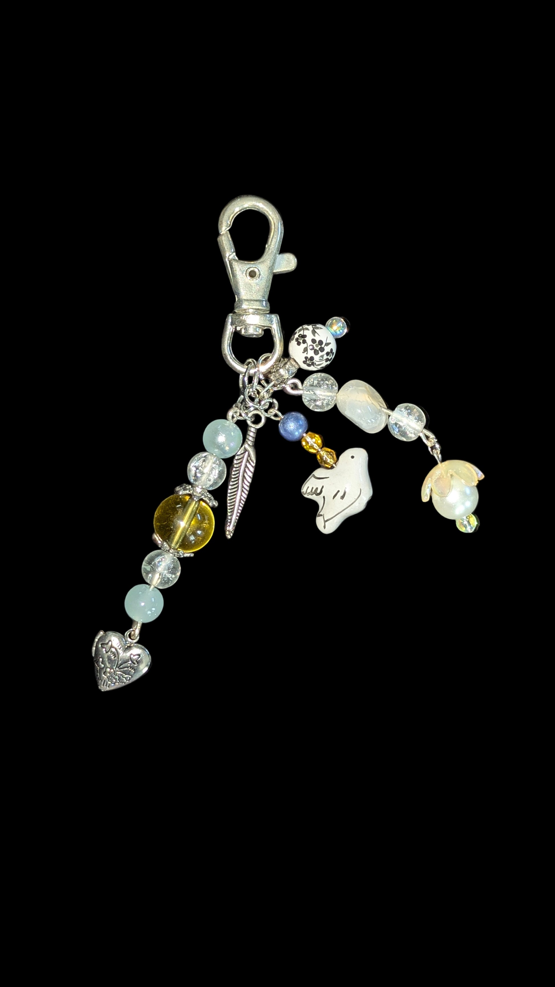Glass and metal, dove and feather charms with a heart locket